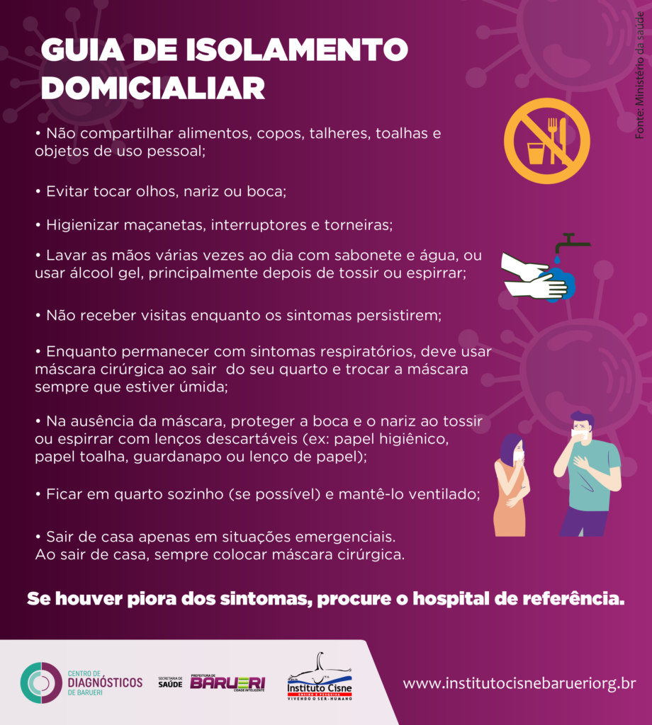 O isolamento social é permanecer em casa, durante 14 dias, a partir da data do início dos seus sintomas. É não frequentar locais públicos, bem como escola e local de trabalho, e sair de casa apenas em situações de emergência. Características do isolamento social: